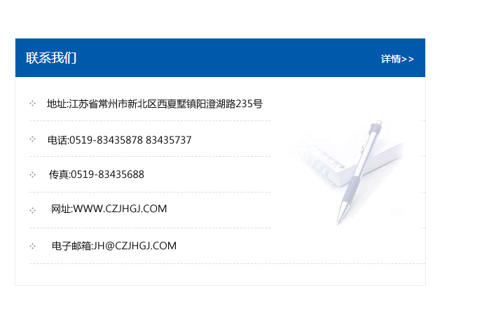 地址:常州市新北區友邦商務大廈1幢16、17層  電話:0519-85101652  傳真:0519-85112595  郵編:213022  網址:www_cz-jiayue_cn.xinqiy.com  郵箱:xiajifengaa@163.com